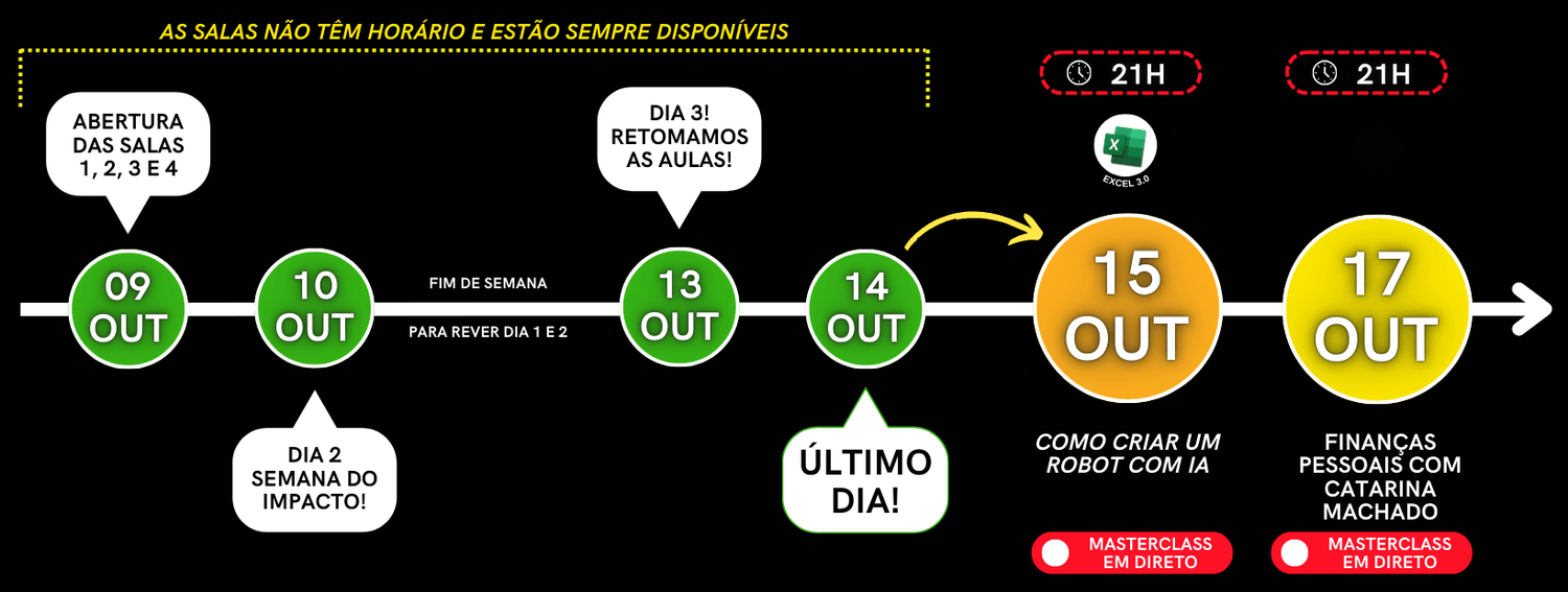 As aulas da Oficina de Excel que decorrem de 09 a 14/10 não são em direto. São gravadas pelo que pode fazer com total liberdade de horários. A Masterclass do dia 15 de Outubro é em direto comigo às 21:00 depois mais perto recebe o link .